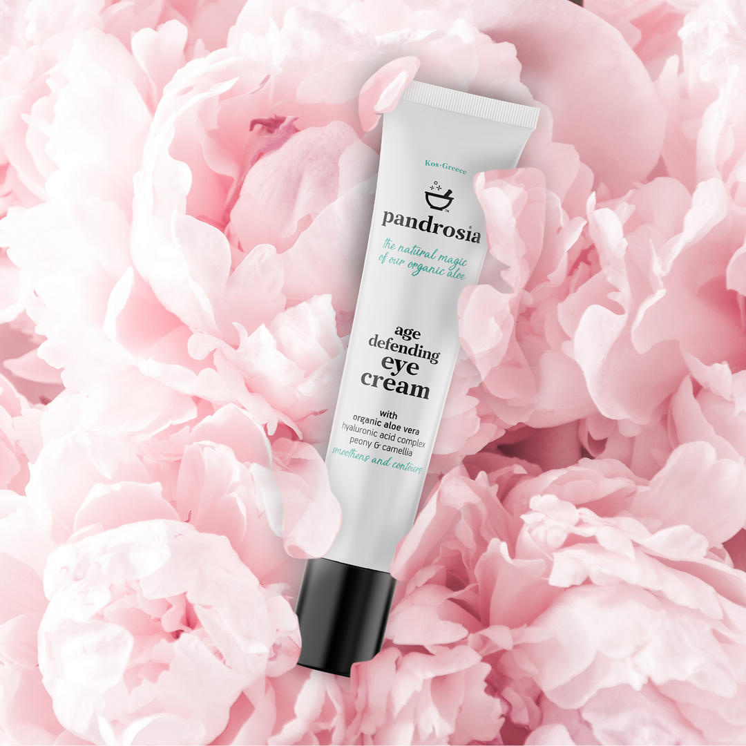 Εκχύλισμα παιώνιας, καμέλιας, σύμπλεγμα υαλουρονικού οξέος & βιολογική αλόη στην age defending eye cream για τριπλή δράση στην περιοχή των ματιών: